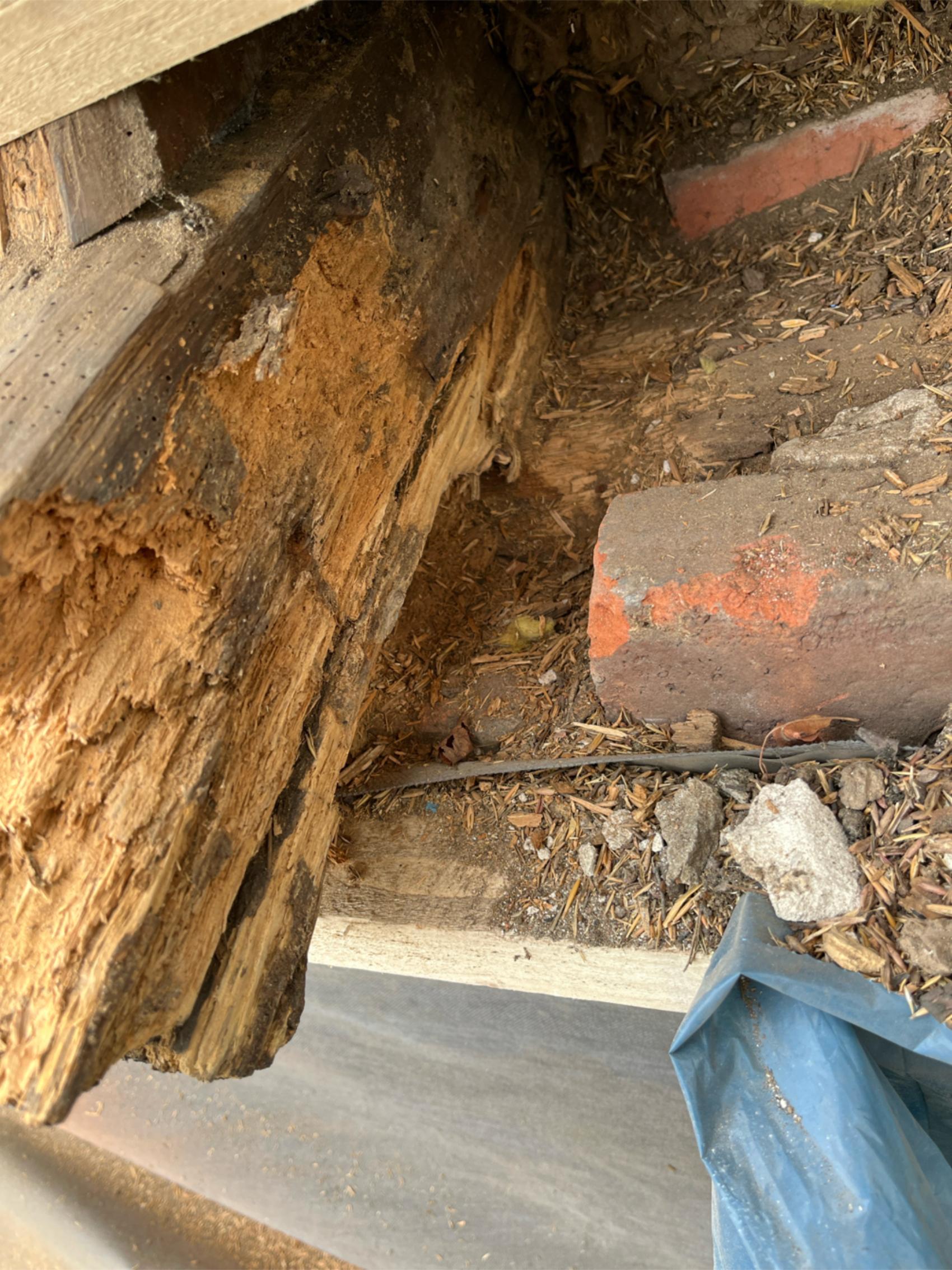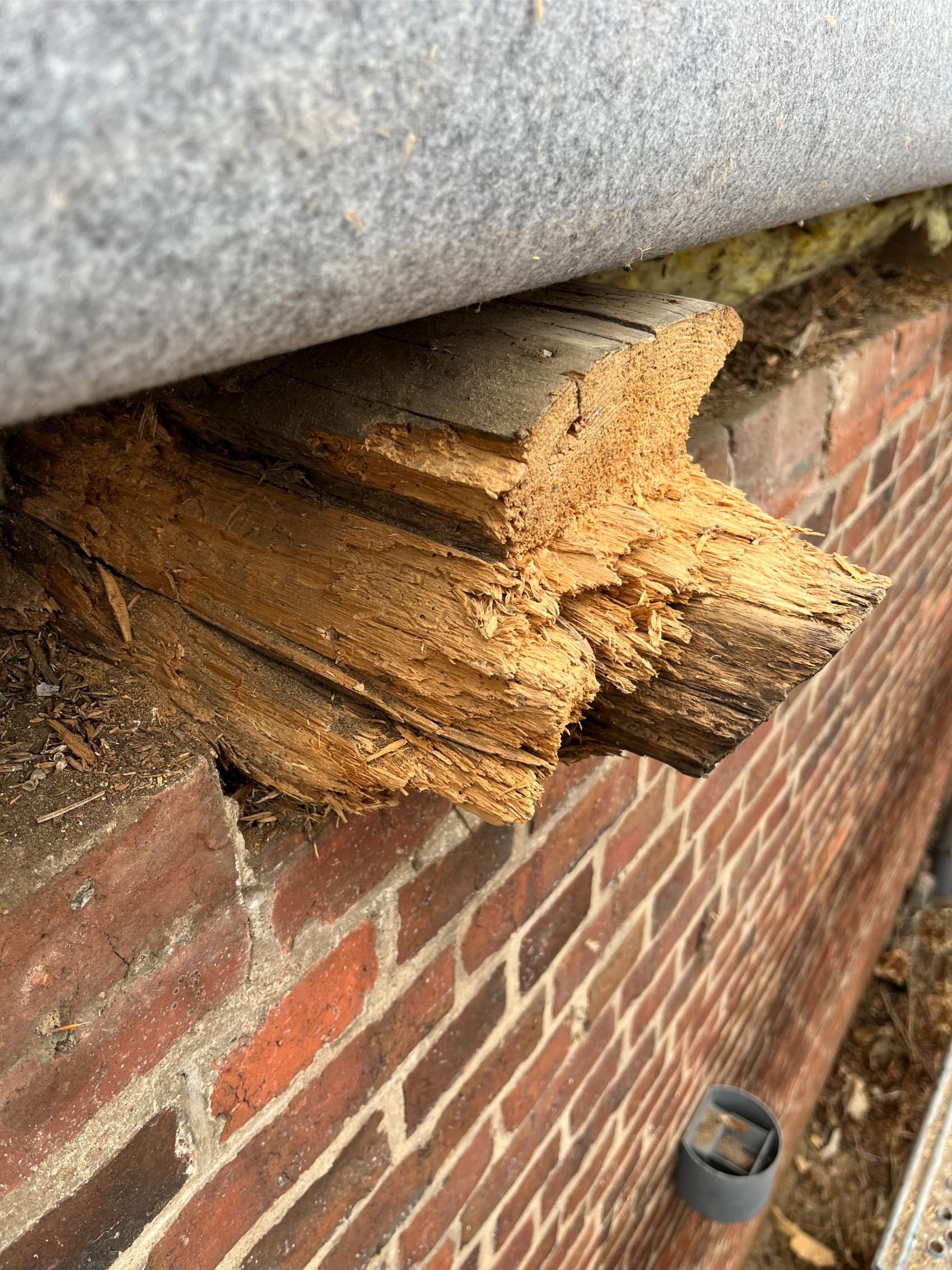 Zu Beginn wurden die alten Dachziegel, Latten und Abdichtungen vollständig entfernt und fachgerecht entsorgt. Während der Arbeiten stellte sich heraus, dass ein Parasitenbefall die Balkenköpfe stark beschädigt hatte. Dieser Befall wurde durch einen Spezialisten behandelt und die befallenen Holzteile anschließend so gut wie möglich repariert.