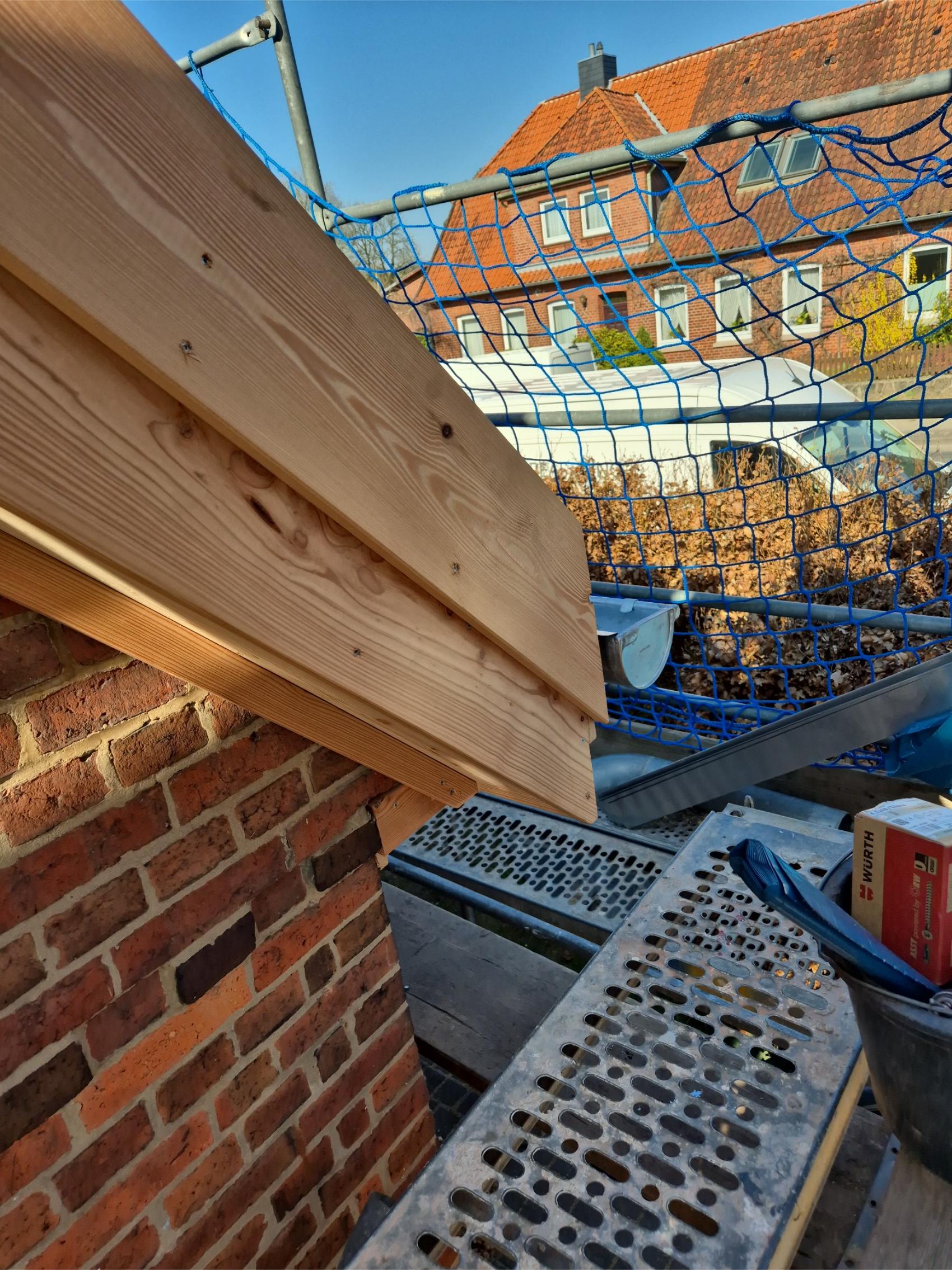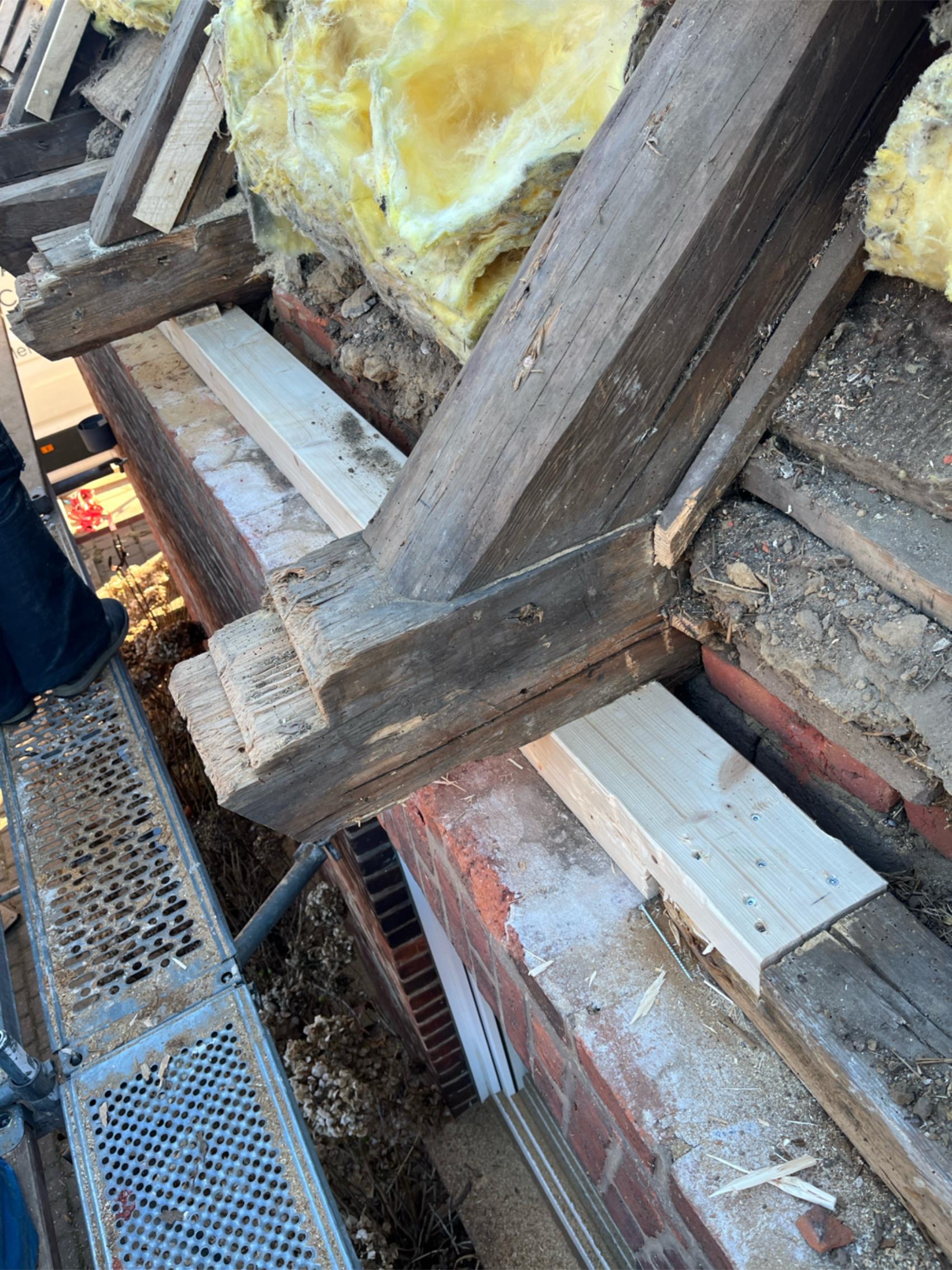 Die geschädigten Balkenköpfe des Dachstuhls wurden instandgesetzt und teilweise verstärkt, um die Tragfähigkeit der Konstruktion dauerhaft sicherzustellen.