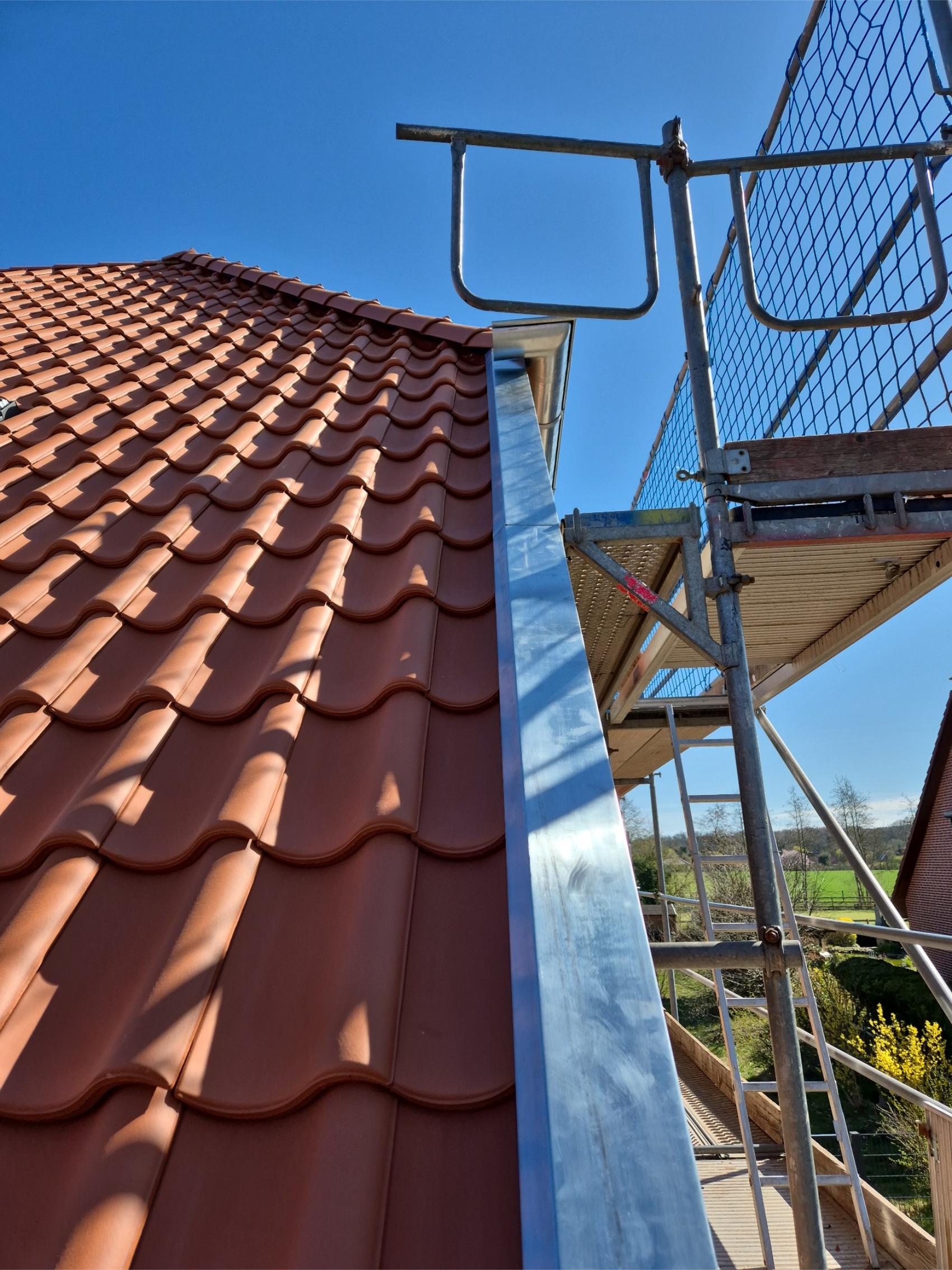 – sowie eine hochwertige Neueindeckung mit Hohlfalzziegeln Meyer-Holsen Vario in Naturrot, ergänzt durch eine fachgerechte Ausbildung von First, Grat und Anschlüssen.